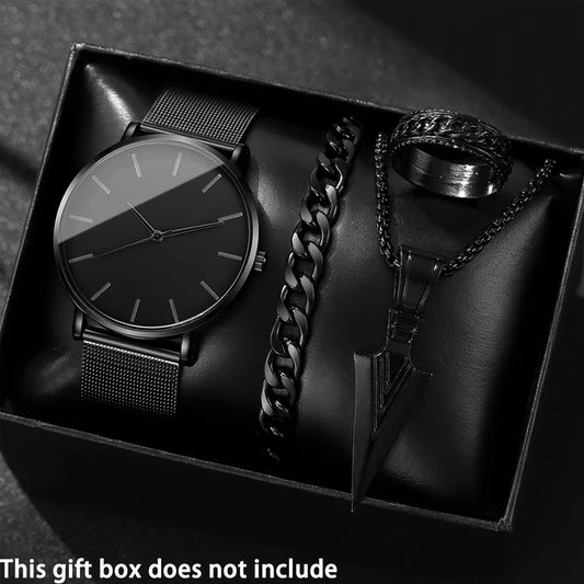 4pcs/set, Minimalist Men Fashion Ultra Thin Watches & Triangle Spearhead Necklace Set, Stainless Steel Mesh Belt Quartz Watch