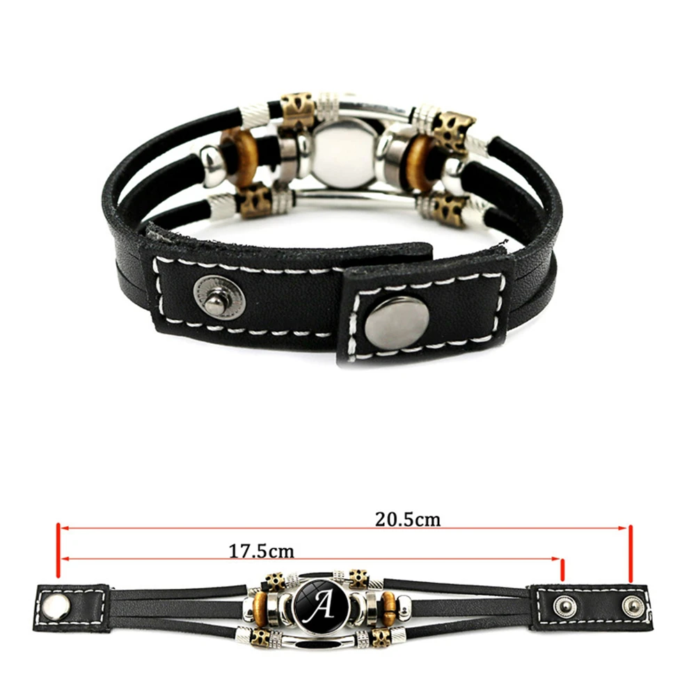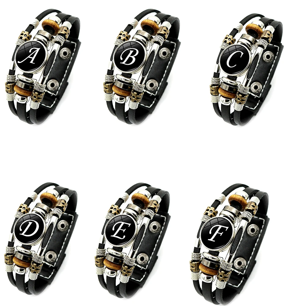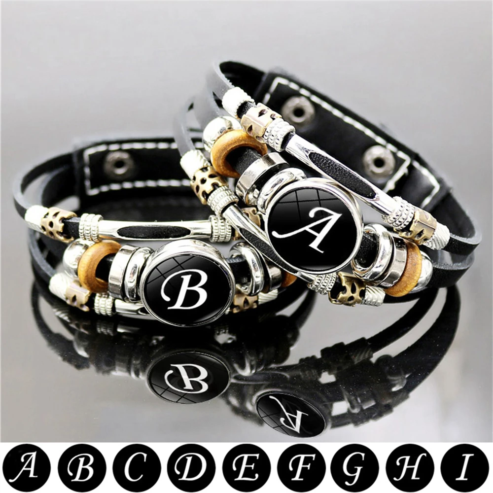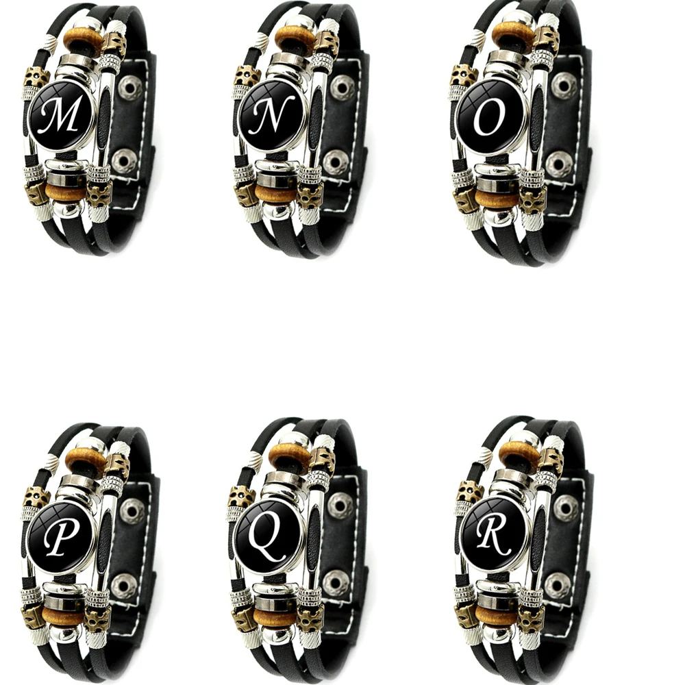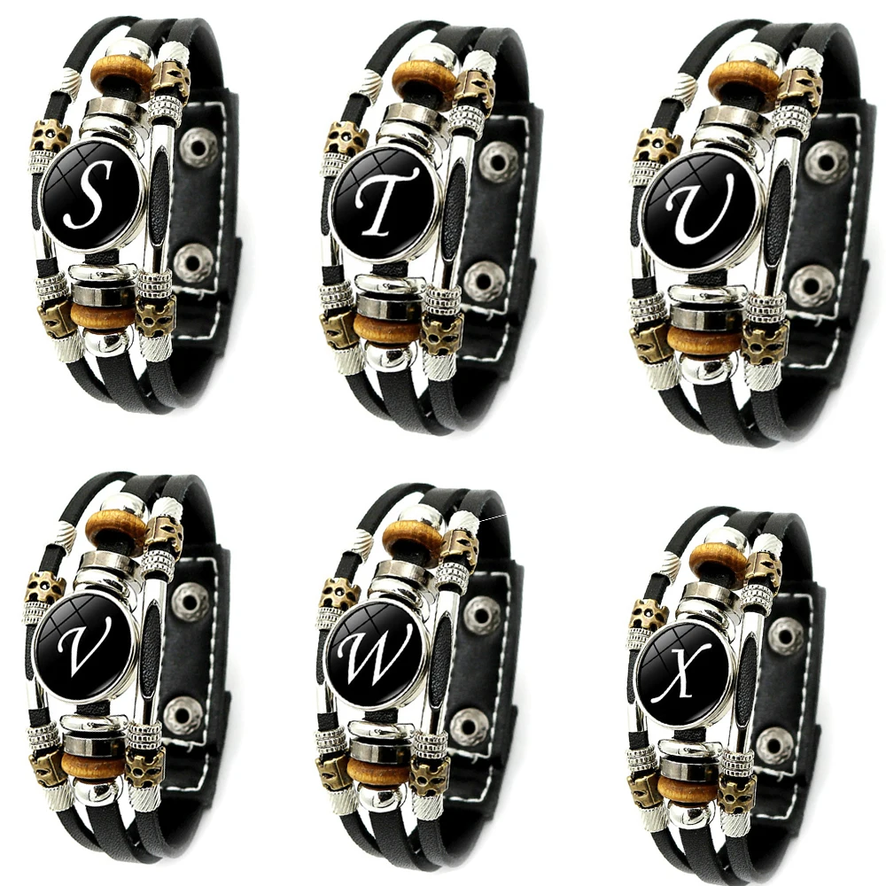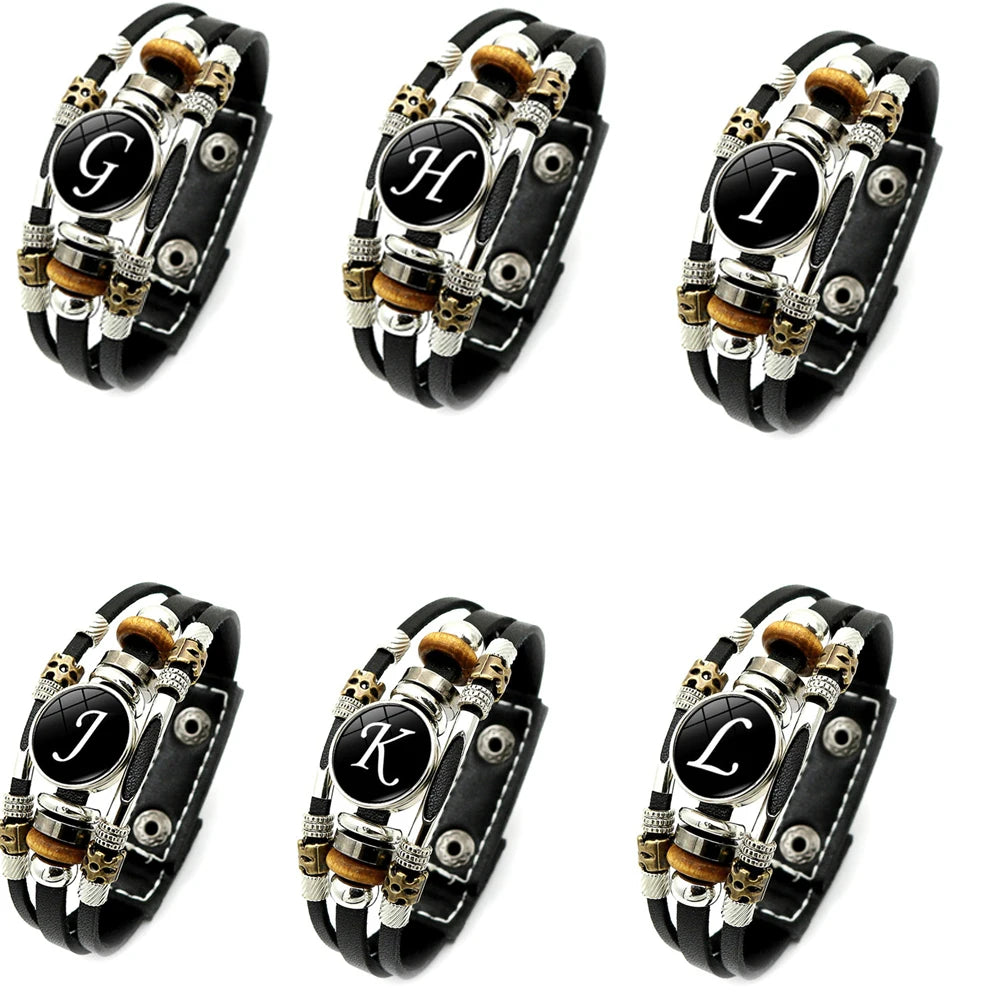 26 Letter A-Z Charms for Bracelets ID Name Friendship Black Braided Multilayer Punk Leather Bracelet Men Women Kids Family Gifts
