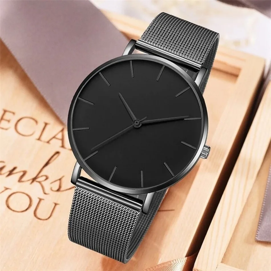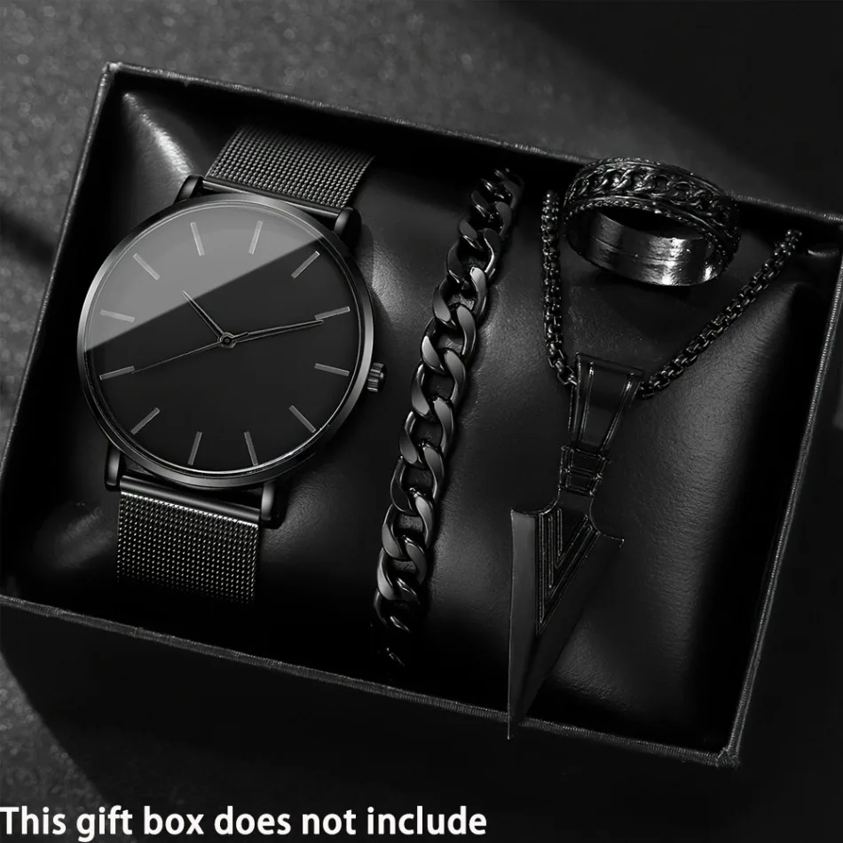 4pcs/set, Minimalist Men Fashion Ultra Thin Watches & Triangle Spearhead Necklace Set, Stainless Steel Mesh Belt Quartz Watch